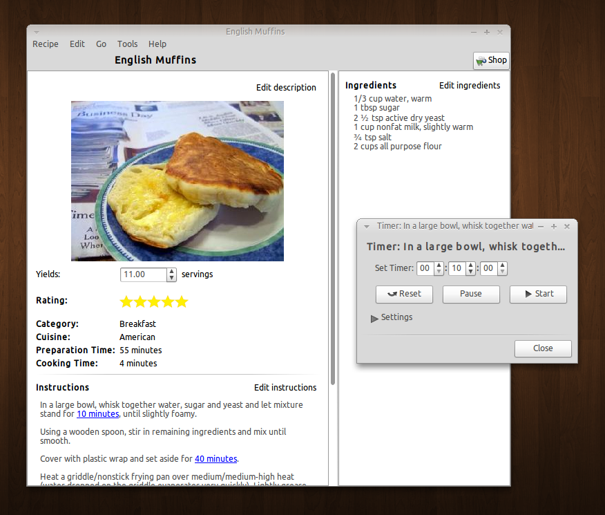 In the last photo you can see my recipe for English Muffins. My photo included on the left side with rating, prep time and instructions. On the the right side is the ingredients list. Any cooking times are included in the recipe will be highlighted and are made clickable which pops up a handy timer. Ive used this many times now.
