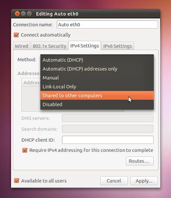 Once in the Auto eth0 settings, click the IPv4 tab, and on the "method" pull down menu make the change from the default "Automatic (DHCP)" to "Shared to other computers". After it has been selected, go down and click Apply and you should be done.