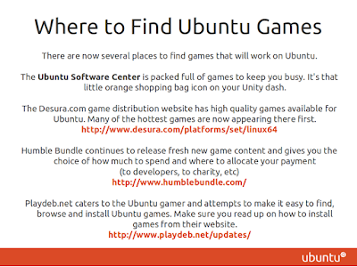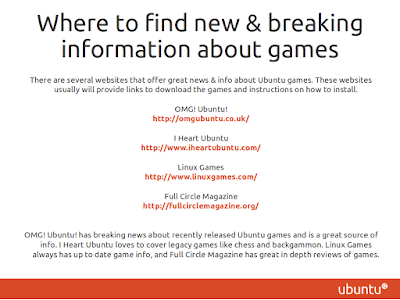 On Wednesday May 2nd 2012 I instructed a lesson about "Gaming On Ubuntu" which gave some great ideas where to look for Ubuntu game news and where to find Ubuntu games. This was part of Ubuntu Open Week. Enjoy!