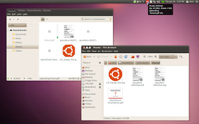 Wuala works great on all versions of Ubuntu and has a simple indicator app for the panel (as with all images in our articles, click the image above to see it larger). From the image you can see the Waula client in the left box which gives you a huge array of preferences and the ability to see the upload % of all your files. The right box in the photo above shows Waula "drive" in Nautilus. The panel applet shows if there are any file transfers going on and mousing over the indicator shows the up/down speeds. You can also pause syncing from the indicator.