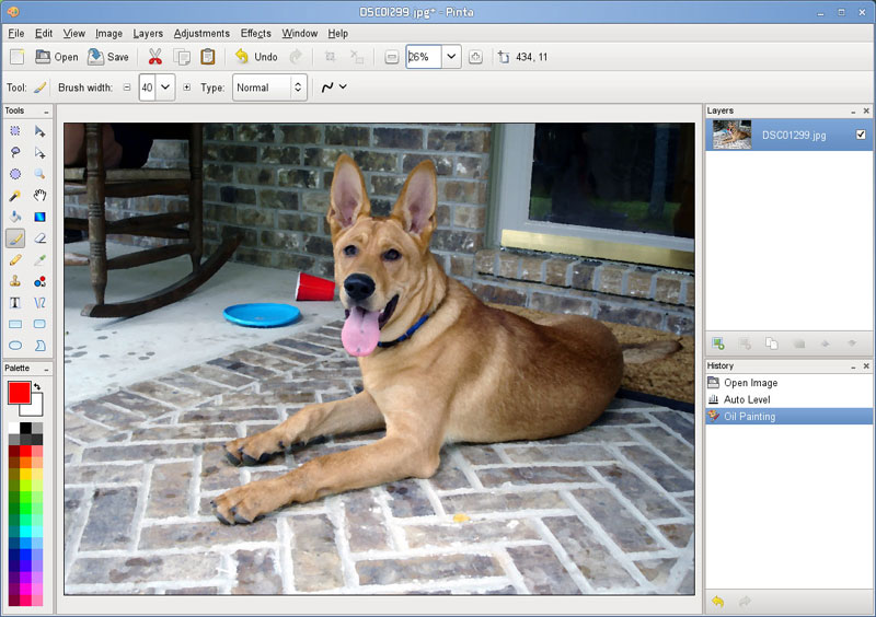 Pinta is an open source paint & drawing program modeled after Paint.NET. For users coming over from Windows, this is a simple program you might feel very comfortable using. Albeit with less options than GIMP, Paint Shop Pro and Adobe Photoshop, Pinta can still do a lot and its lightweight too.
