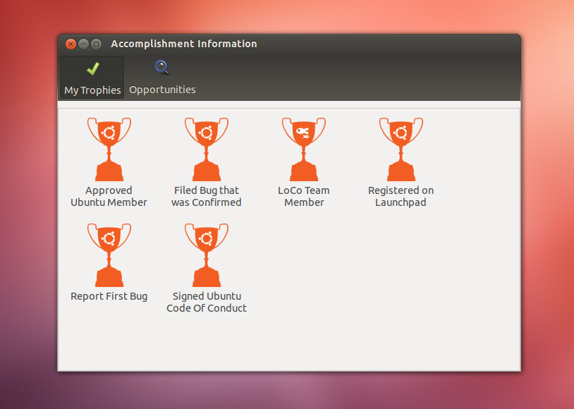 Accomplishments range from the basic tasks of registering with Launchpad, signing the Ubuntu code of conduct to more prestigious triumphs like becoming a community council member or an Ubuntu core developer. This app has now been realized.