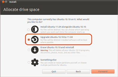 Select the second option “Upgrade Ubuntu XX.XX to XX.XX”. If you dont have this option dont continue as you might end up erasing your data.