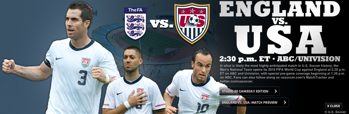 An hour to go folks! USA v. England in the World Cup held in South Africa. Pre- game will be live on ABC (as well as spanish station Univision) starting at 11am pacific time and the match starts at 11:30am. If you're stuck at a computer, try ESPN3.com or look for a live link here... http://atdhe.net/