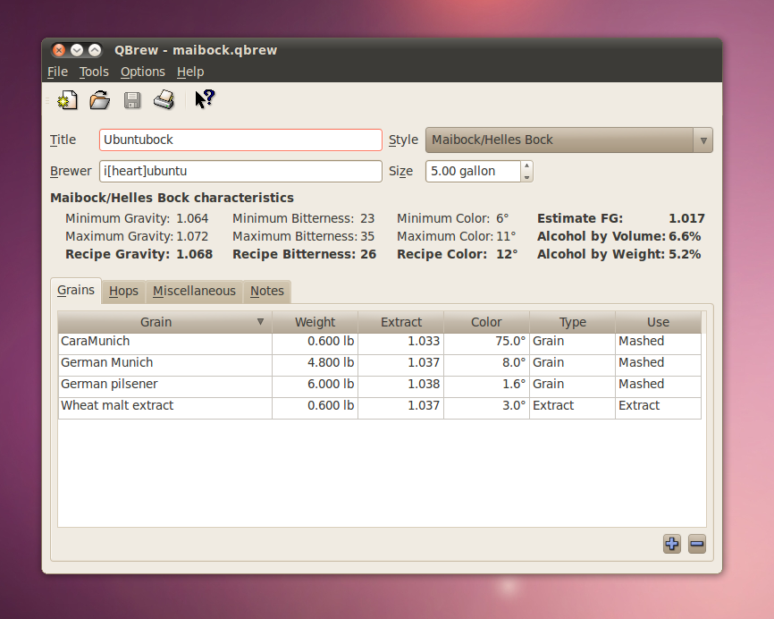 I gave it a test run and like it a lot so far! Click the image above to see an example. You can input your grains, hops, yeast and other additives plus add in your brewing notes. The qbrew program does all the work for you and gives you the estimated alcohol content, bitterness, color rating and more. You can save your recipe to a qbrew file and also export it as HTML, PDF, Text or a BeerXML file.