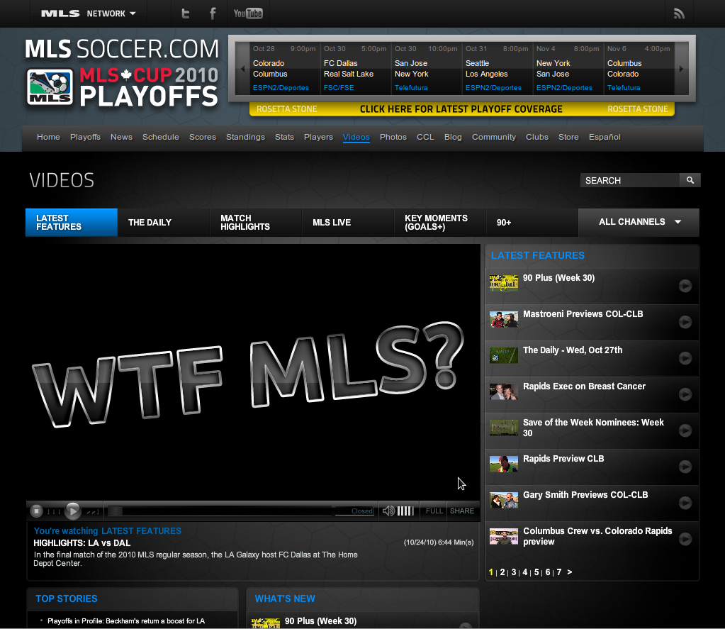 As you can see in the screen grab above, the Major League Soccer videos do not work in Ubuntu. At the beginning of the 2010 season it was announced that MLS would start streaming live video feeds in much higher quality than in previous years. Along with the news, came the horrific fact that the newly revamped & beautiful website was going to use Microsoft Silverlight. I really didnt think much about this, because the Vancouver Winter Olympics website also used Silverlight for videos. I simply installed Moonlight, the linux equivalent, and I got to see the winter olympics highlights.