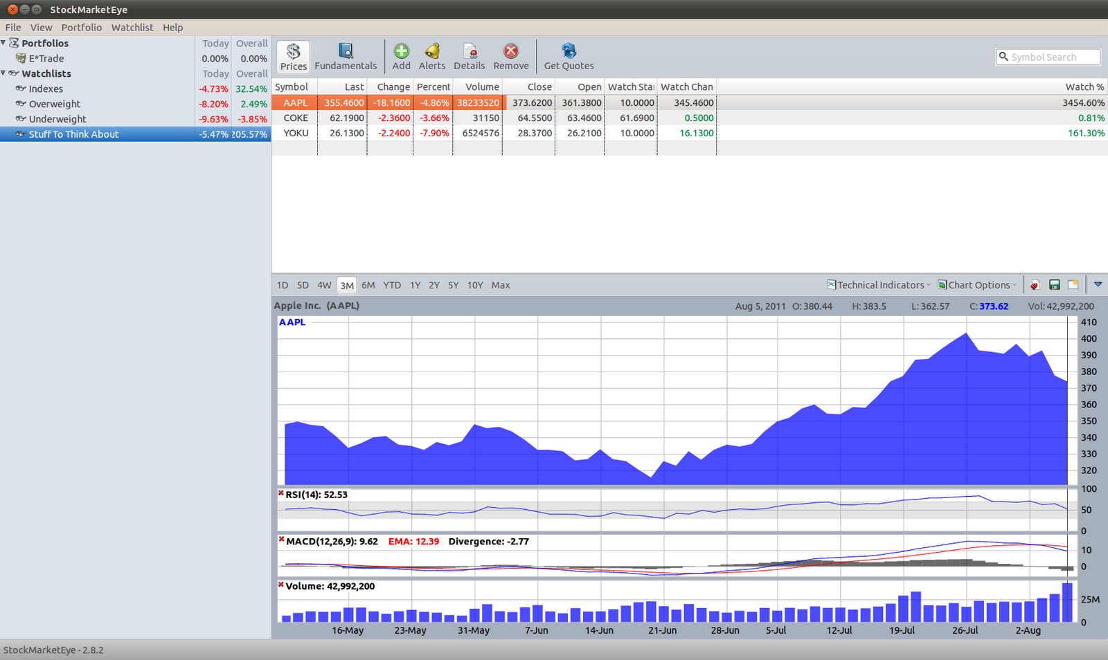 The new version of Stock Market Eye is very user friendly (unlike most stock tracking software) and packed with a bunch of great tools. This is by far one of the best stock trading programs, best of all there are no monthly fees and it works great on Ubuntu linux too!!