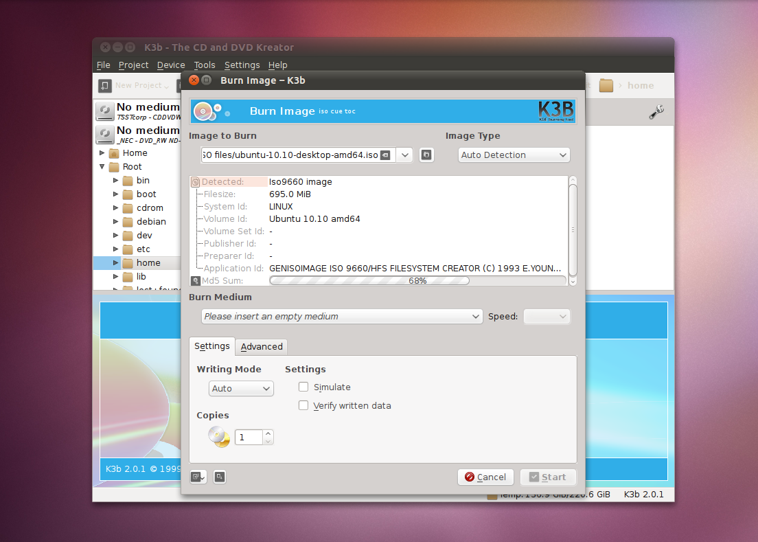 If you have located the image, K3B will perform a checksum on the image to make sure it matches. When the checksum is complete, and that appropriate media is inserted into the drive, you can click the Start button to start the burning process.