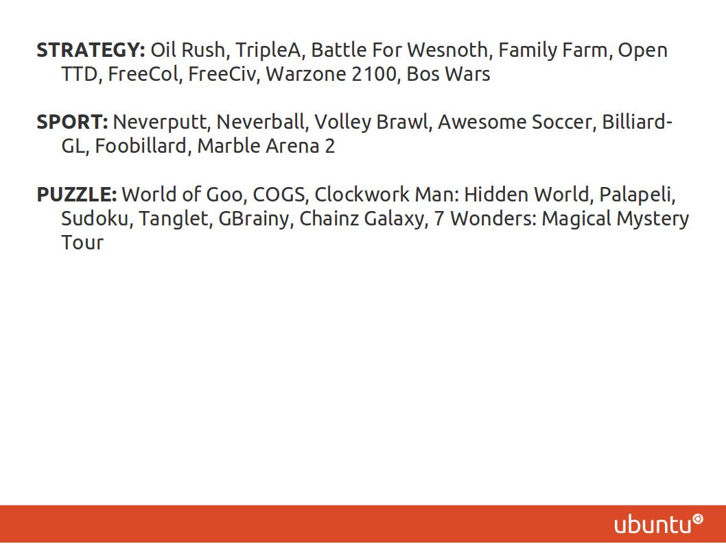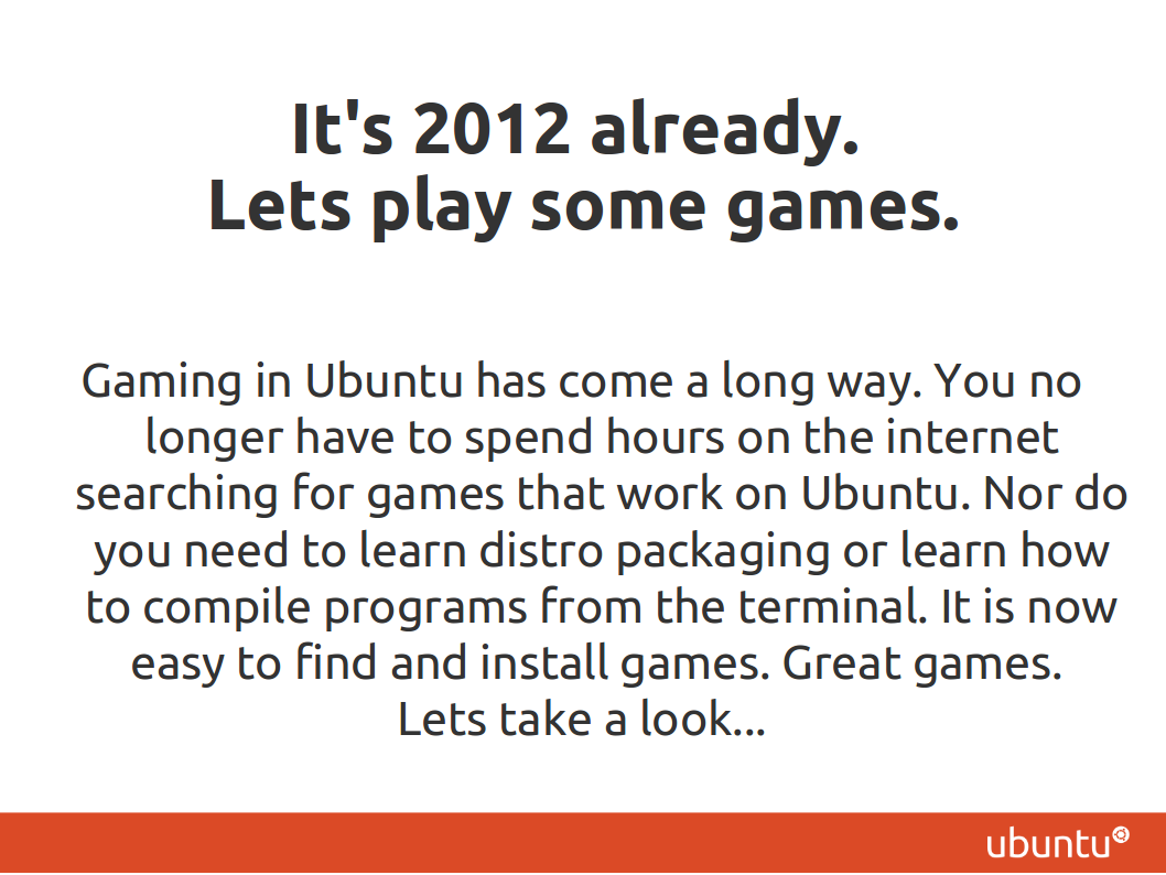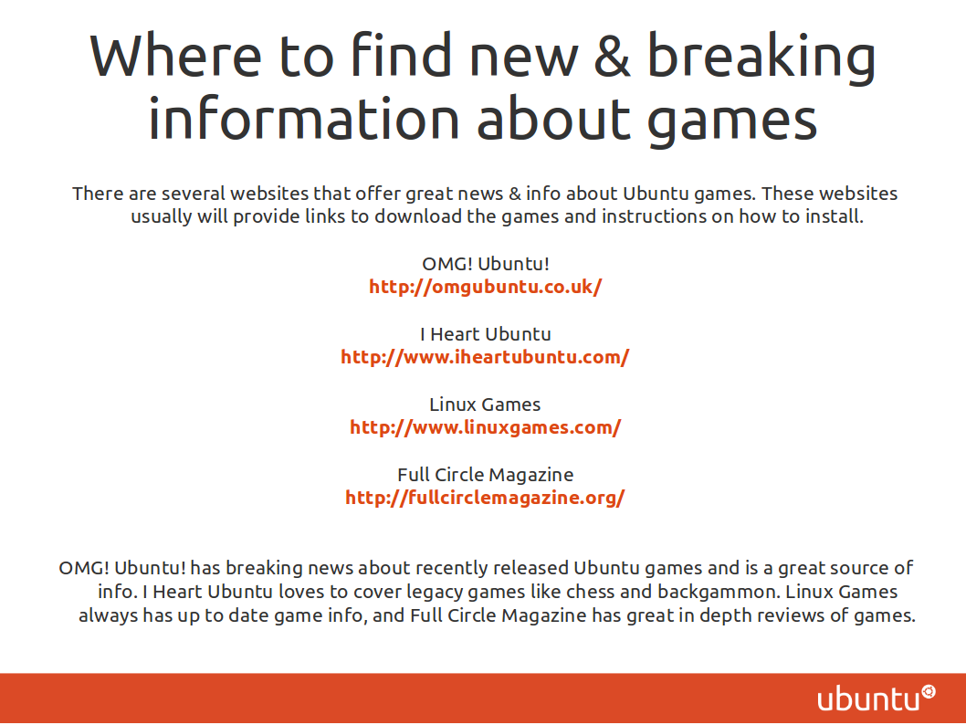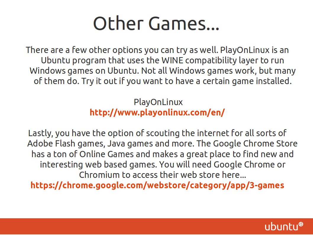 On Wednesday May 2nd 2012 I instructed a lesson about "Gaming On Ubuntu" which gave some great ideas where to look for Ubuntu game news and where to find Ubuntu games. This was part of Ubuntu Open Week. Enjoy!